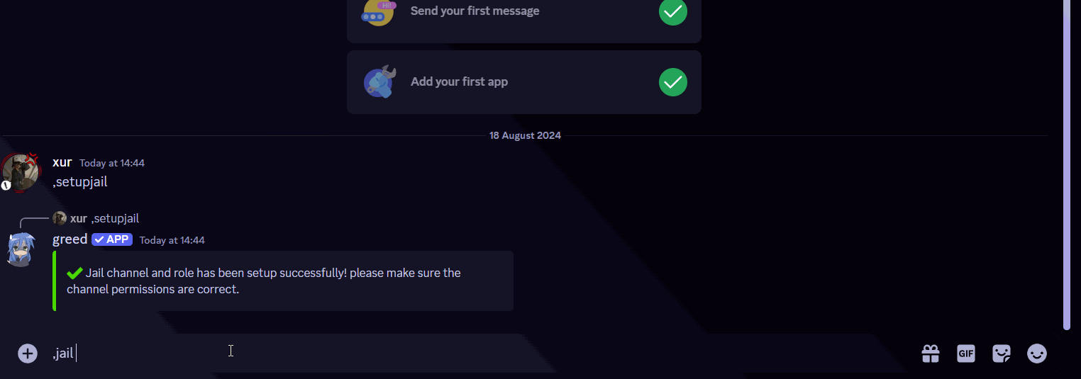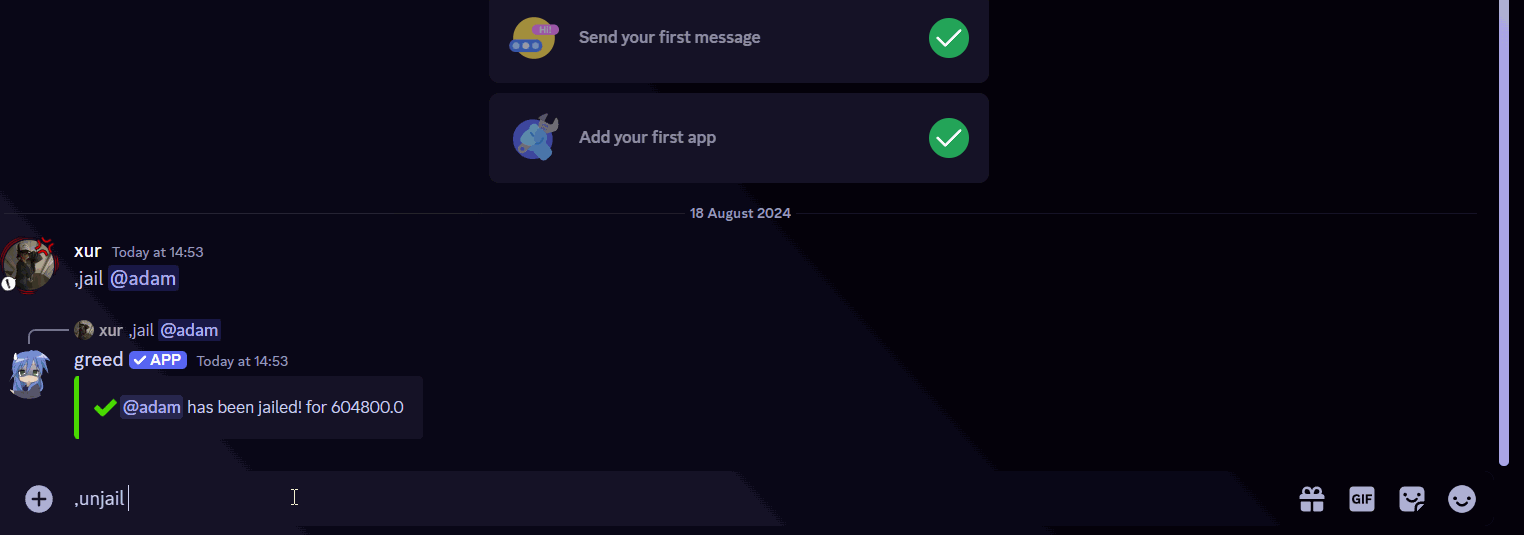 ,jail <user>for example,jail @x6urin any channel. - This command will automatically mutes the user in every channel besides